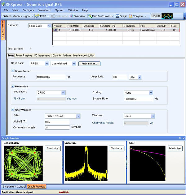 RFXpress 是強(qiáng)大而又簡(jiǎn)便易用的軟件包,為任意波形發(fā)生器(AWG)生成IQ 和IF 信號(hào)。它作為AWG5000B 系列任意波形發(fā)生器的內(nèi)置部分運(yùn)行,或從外部PC上運(yùn)行。