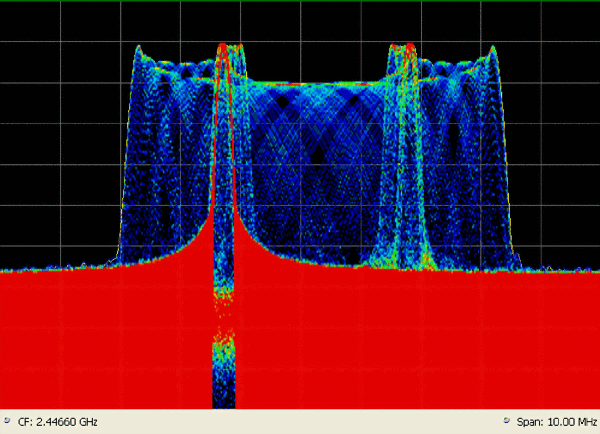 革命性的DPX頻譜畫面揭示了瞬變信號行為,幫助您發(fā)現(xiàn)不穩(wěn)定性、毛刺和干擾。在這里,可以詳細查看發(fā)生不頻繁的瞬變信號。發(fā)生頻次用顏色等級表示,不頻繁的瞬變事件用藍色表示(右面),噪聲背景用紅色表示。