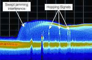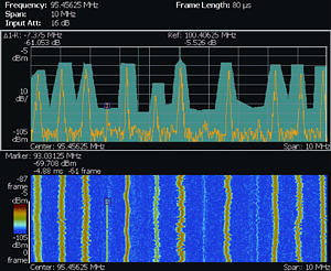 革命性的DPXTM 頻譜顯示技術(shù)可以簡便地發(fā)現(xiàn)其它信號分析儀漏掉的信號。這里看到的是空中捕獲的存在嚴(yán)重屏蔽干擾情況下的跳頻信號。