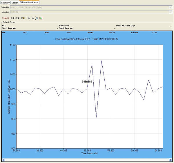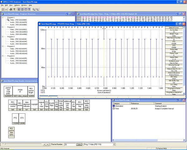 節(jié)目顯示MTS4SA提供了一種節(jié)目顯示方式,用戶(hù) 可以快速查看節(jié)目項(xiàng)中的傳送流內(nèi)容、 每個(gè)節(jié)目的使用比特率以及按照TASC、 DVB TR101 290 或ISDB 標(biāo)準(zhǔn)測(cè)試的結(jié) 果。并分別以紅、淡黃和綠色的LED 指 示來(lái)表示與每個(gè)節(jié)目或元素相關(guān)的錯(cuò)誤。 可以將在節(jié)目流分層的較低層次上檢測(cè) 到的錯(cuò)誤擴(kuò)展至最高層次。因此,用戶(hù)可 以在某一較高層次上監(jiān)視碼流中的所有 節(jié)目,然后在必要時(shí)迅速進(jìn)入較低層次 以查尋故障。 測(cè)試顯示在測(cè)試顯示(tests view)中,您可以將錯(cuò)誤 定位到已施加到傳送流的某一特定的測(cè) 試項(xiàng)中,您可以按照您選擇的測(cè)試來(lái)自 動(dòng)過(guò)濾錯(cuò)誤日志記錄,當(dāng)然,您也可以按 照PID 來(lái)過(guò)濾。除了在TR 101 290 標(biāo)準(zhǔn) 中所規(guī)定的第一、第二、第三優(yōu)先級(jí)測(cè)試 之外,您還可以測(cè)試PCR抖動(dòng)和節(jié)目/PID 比特率。所提供的可變性測(cè)試能使您測(cè) 試到特定PID中比特率的變化情況。除了 按照TR 101 290 標(biāo)準(zhǔn)進(jìn)行測(cè)試外,您還 可以對(duì)ATSC、ISDB-T 和ISDB-S 碼流進(jìn) 行許多特定的測(cè)試。 SI/PSI 和PSIP(表)顯示在SI/PSI 和PSIP 表顯示中,您可以觀(guān)察 到被分析碼流中所包含的業(yè)務(wù)信息表, 它應(yīng)當(dāng)服從于所選擇的數(shù)字視頻標(biāo)準(zhǔn)。 這包括ATSC PSIP、DVB和ISDB 業(yè)務(wù)信 息和MPEG 節(jié)目特定信息。 在SI/PSI 和PSIP 表的提要顯示中,以一 種有意義的方式給出了每一種表的主要 數(shù)值顯示,其中包括超鏈接顯示,通過(guò)這 個(gè)超鏈接,您可以迅速地訪(fǎng)問(wèn)其它表中 或其它顯示中的相關(guān)信息。 PID 顯示在PID 顯示中,給出了該傳送流中所有 PID的相關(guān)信息。如果您選擇了某一PID, 則其相關(guān)聯(lián)的提要顯示就能提供該傳送 流的PID定向圖示。這種信息可以呈柱狀 圖形,也可以呈餅狀圖形顯示。彈出菜單 給出了快速的容限選擇。 如果有一項(xiàng)或多項(xiàng)測(cè)試失效,那么在相 關(guān)的PID下會(huì)列出各項(xiàng)失效的測(cè)試。您可 以選擇特定的PID 以顯示所有相關(guān)測(cè)試 的提要。還可以選擇特定的測(cè)試以顯示 其事件日志記錄和參數(shù)。 數(shù)據(jù)包顯示在數(shù)據(jù)包顯示中,可以給出按照內(nèi)容分 組的傳送流中的所有數(shù)據(jù)包信息。這種 組合包括PID 數(shù)值、SFN 兆幀(Megaframe) 初始包(MIP,僅DVB)和信息 包(IIP,僅ISDB-T)。如果您選擇了特定 的PID或MIP,那么只顯示出具有特定PID 或MIP 的數(shù)據(jù)包。 字段(Section)顯示字段顯示使用的是可定制的腳本文件, 用戶(hù)可以指定并顯示專(zhuān)用信息。 MTS4SA可以提供表及其數(shù)據(jù)源顯示。這 種顯示(以十六進(jìn)制數(shù)值格式和ASCII字 符格式)給出了被選表、版本和字段的數(shù) 據(jù)字節(jié)。MTS4SA可以十分方便地分析表 和子表,并能直接跟蹤至包數(shù)據(jù)。 字段圖形(Section Graphing) 字段重復(fù)間隔-這種圖形給出了某一特 定PID 的表中兩個(gè)字段之間的間隔顯示。 子表相交間隙(Sub-table intersection gap)-這種圖形給出了某一特定子表中 字段之間的間隔顯示。 子表重復(fù)間隔-這種圖形給出了收到一 個(gè)完整子表與收到下一個(gè)完整子表之間 的時(shí)間顯示。 實(shí)時(shí)和延時(shí)電子節(jié)目指南(EPG)顯示在EPG顯示中,可以迅速地跨越許多EIT 表進(jìn)行查驗(yàn),并可以從當(dāng)?shù)貢r(shí)間、UTC時(shí) 間或傳送流自身時(shí)間中設(shè)置時(shí)間零值。 所顯示的EPG 事件的天數(shù)由廣播業(yè)主決 定,但不受分析儀局限。如果選擇了一個(gè) 傳送流EPG,則通過(guò)面板給出當(dāng)前在事 件面板(event panel)中顯示的業(yè)務(wù)名稱(chēng)。 所顯示的業(yè)務(wù)將取決于導(dǎo)航圖形中的被 選節(jié)點(diǎn)(node)。MTS4SA支持ATSC、DVB 和ISDB 標(biāo)準(zhǔn)中的電子節(jié)目指南。 PCR 分析利用MTS4SA系列,可以按照TR 101 290 標(biāo)準(zhǔn)進(jìn)行全面的PCR 測(cè)量。如果被選的 基本流PID 含有PCR 信息,就可以使用 PCR 分析顯示,所給出的顯示圖形有: PCR 準(zhǔn)確度、PCR 到達(dá)間隔、PCR 總抖 動(dòng)、PCR 頻率偏置以及PCR 漂移率。 在實(shí)時(shí)分析和延時(shí)分析中可以取得PCR 圖形。時(shí)間標(biāo)記數(shù)據(jù)確保PCR 圖形的捕 獲并提供碼流記錄顯示。MTS4SA的時(shí)間 標(biāo)記與由泰克公司其它設(shè)備( 包括 MTM400傳送流監(jiān)視器)所取得的記錄相 兼容。在上述重要的PCR 測(cè)量中,可選 的MGF過(guò)濾器提供了最大限度的靈活性 和兼容性。 MTS4SA 系列還可以在實(shí)時(shí)分析或延時(shí) 分析中提供PTS到達(dá)間隔圖形顯示,如圖 所示。 |