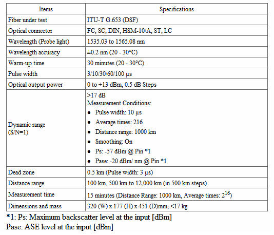 其WINDOWS的圖形化操作界面、快速的測(cè)試速度、強(qiáng)大的存儲(chǔ)能力該用戶的測(cè)試帶來(lái)了最大的便捷性。MW90010A是目前全世界唯一的可以用來(lái)測(cè)試海底光纜的相干光時(shí)域反射儀,其可以測(cè)試超長(zhǎng)距離的海底光纜,測(cè)試距離可以達(dá)到12,000Km,是理想的海底光纜測(cè)試與維護(hù)工具。