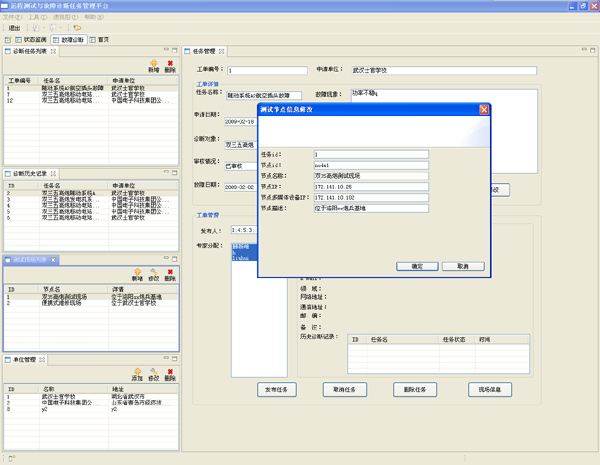 ● 任務(wù)管理 R-ATE由測試與診斷任務(wù)驅(qū)動。因此遠(yuǎn)程服務(wù)中心提供測試與診斷任務(wù)管理組件。包括測試與診斷任務(wù)的添加、編輯、發(fā)布或取消;診斷歷史記錄瀏覽;測試現(xiàn)場的添加、刪除,協(xié)作單位的添加與刪除、診斷任務(wù)的專家分配等。 ![]()