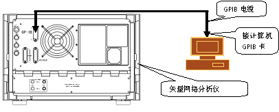 計(jì)算機(jī)通過GPIB接口卡或者網(wǎng)線與矢量網(wǎng)絡(luò)分析儀相連接。GPIB接口連接示意圖如下: ![]() 系統(tǒng)連接示意圖
