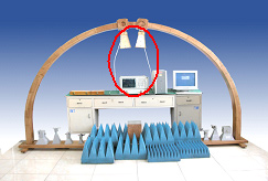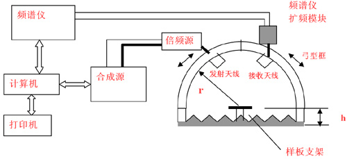 ![]() ? 上圖為本系統(tǒng)典型反射率測試應(yīng)用之二:收發(fā)天線擺放在弓形框上,將標準金屬板放在樣板支架上,在主控計算機的控制下AV1487系列信號源源通過發(fā)射天線將信號發(fā)射出去,發(fā)射信號通過金屬板反射到接收天線(此時相當于全反射),最后AV4036系列頻譜儀接收到此反射信號,獲得一組數(shù)據(jù);然后用待測RAM樣板替換標準金屬板,系統(tǒng)再獲取一組數(shù)據(jù)。通過兩組數(shù)據(jù)相比可以得到被測樣品的反射率。計算機通過GPIB總線獲得測量數(shù)據(jù),可以進行顯示、打印、儲存等后續(xù)操作。